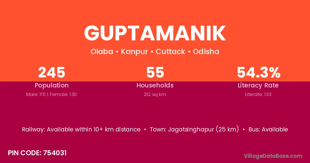 Jagatsinghapur (25 km) is the nearest town to Guptamanik village for major economic activities and is located approximately 25 km away.