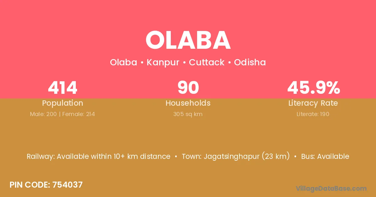 Jagatsinghapur (23 km) is the nearest town to Olaba village for major economic activities and is located approximately 23 km away.