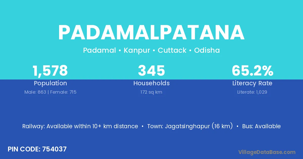 Jagatsinghapur (16 km) is the nearest town to Padamalpatana village for major economic activities and is located approximately 16 km away.