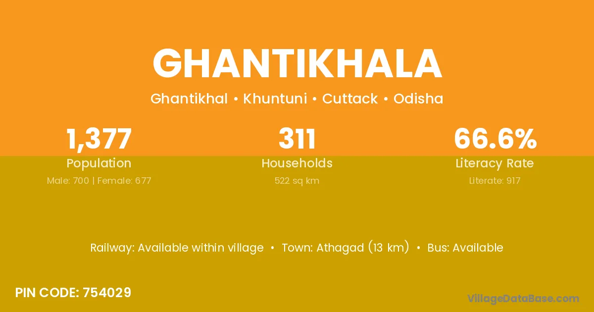 Ghantikhala village has a total population of 1,377 people, of which 700 are males and 677 are females.