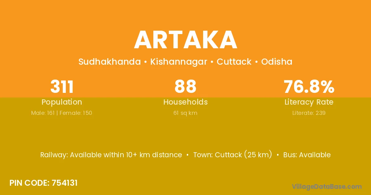 Cuttack (25 km) is the nearest town to Artaka village for major economic activities and is located approximately 25 km away.