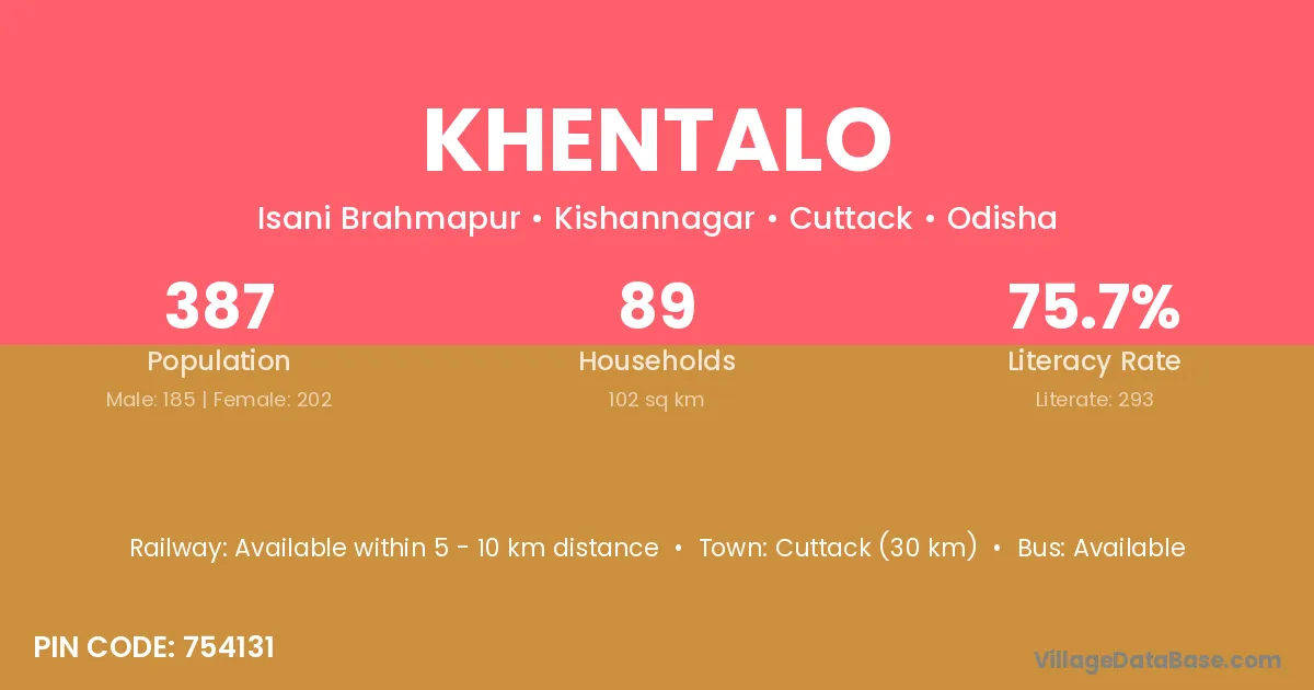 Cuttack (30 km) is the nearest town to Khentalo village for major economic activities and is located approximately 30 km away.
