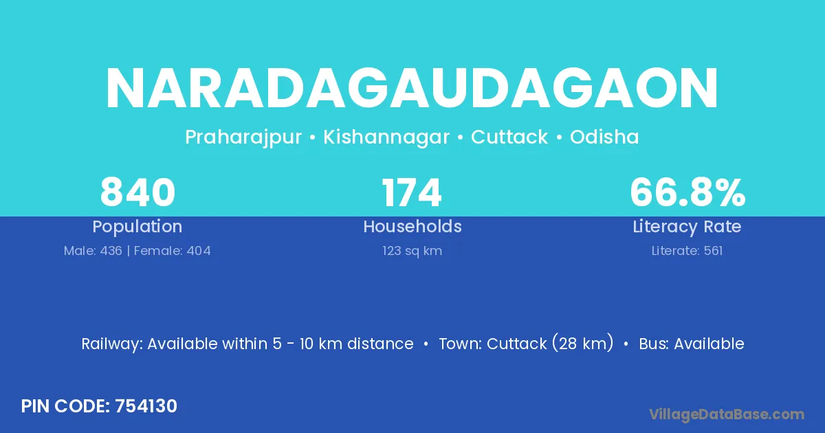 Cuttack (28 km) is the nearest town to Naradagaudagaon village for major economic activities and is located approximately 28 km away.