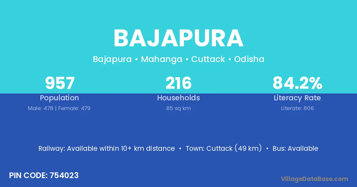 Cuttack (49 km) is the nearest town to Bajapura village for major economic activities and is located approximately 49 km away.