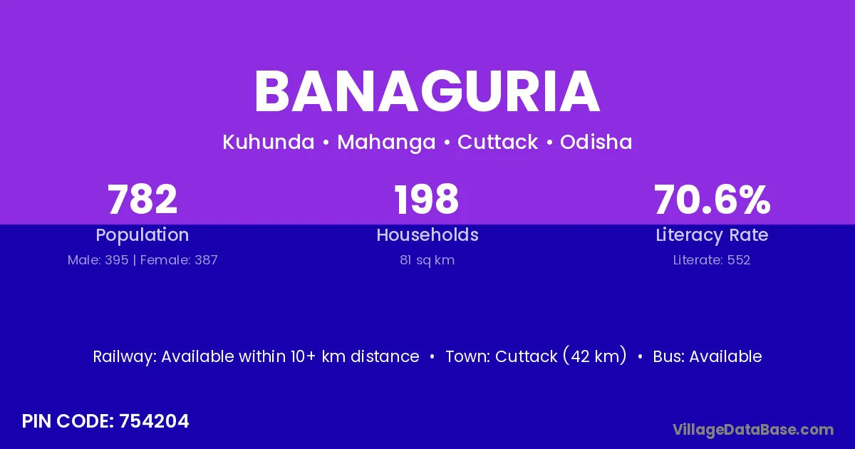Cuttack (42 km) is the nearest town to Banaguria village for major economic activities and is located approximately 42 km away.