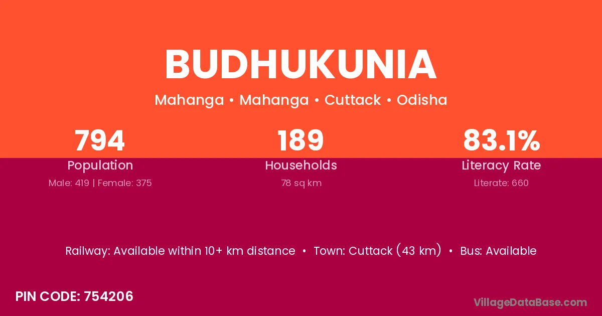 Cuttack (43 km) is the nearest town to Budhukunia village for major economic activities and is located approximately 43 km away.