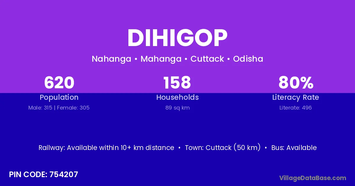 Cuttack (50 km) is the nearest town to Dihigop village for major economic activities and is located approximately 50 km away.