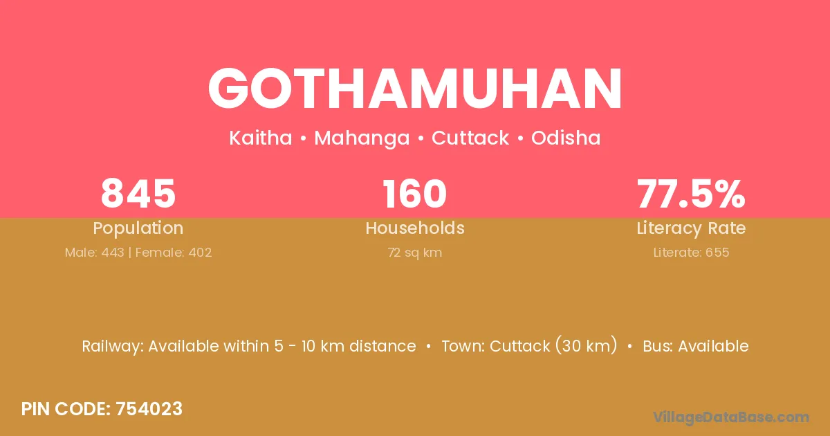 Cuttack (30 km) is the nearest town to Gothamuhan village for major economic activities and is located approximately 30 km away.
