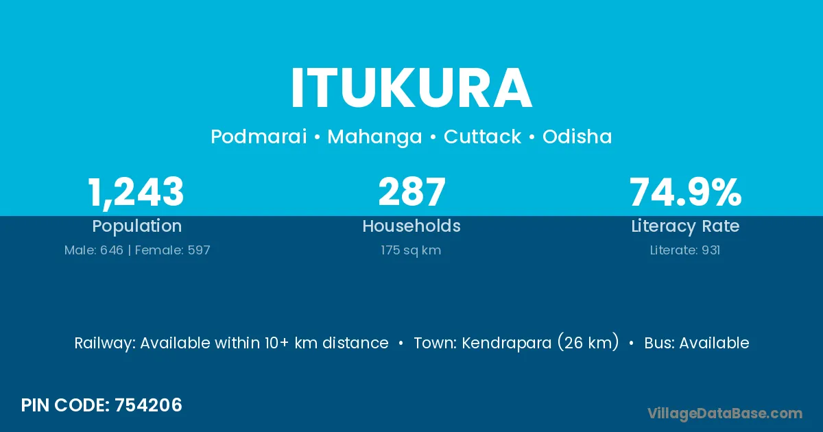 Kendrapara (26 km) is the nearest town to Itukura village for major economic activities and is located approximately 26 km away.