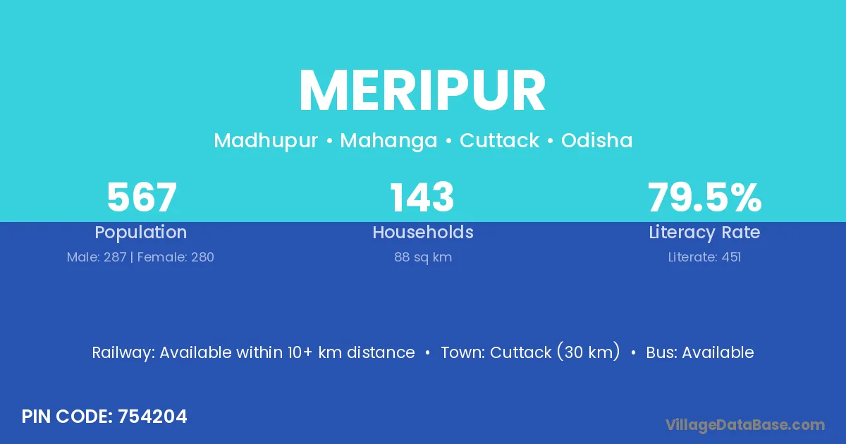 Cuttack (30 km) is the nearest town to Meripur village for major economic activities and is located approximately 30 km away.