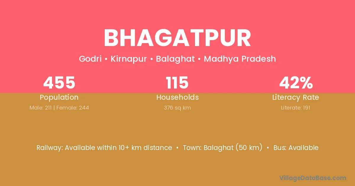 The literacy rate of Bhagatpur village is 46.94%. Male literacy stands at 63.27% and female literacy at 30.61%.