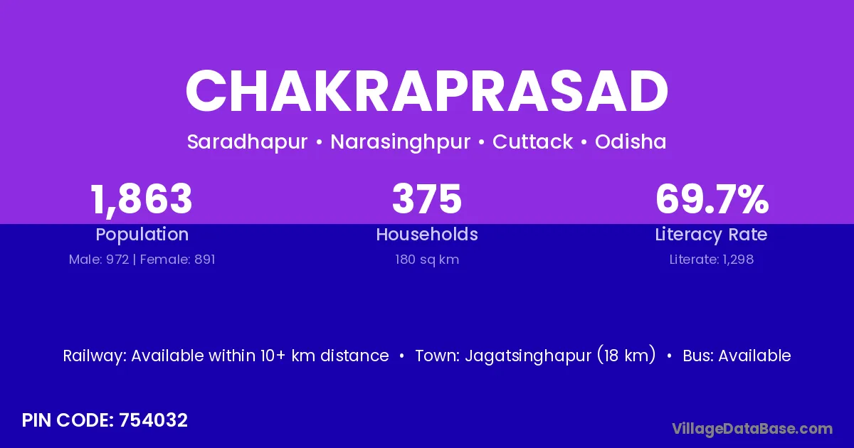 Jagatsinghapur (18 km) is the nearest town to Chakraprasad village for major economic activities and is located approximately 18 km away.