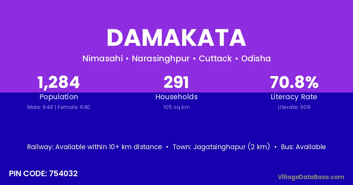 Jagatsinghapur (2 km) is the nearest town to Damakata village for major economic activities and is located approximately 2 km away.