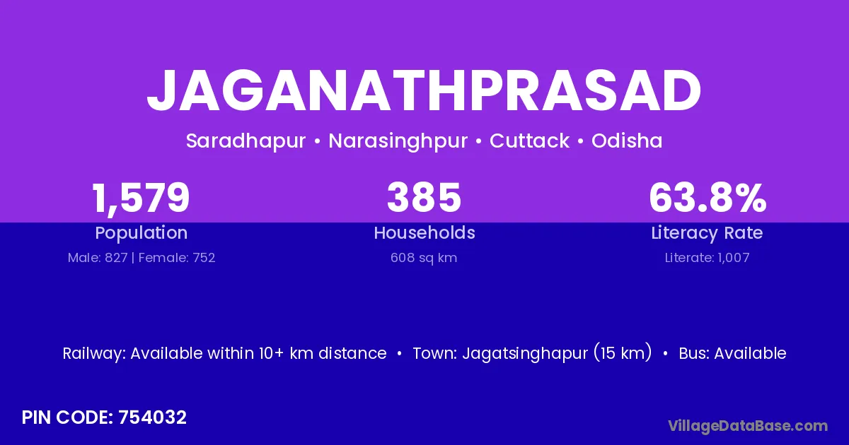 Jagatsinghapur (15 km) is the nearest town to Jaganathprasad village for major economic activities and is located approximately 15 km away.