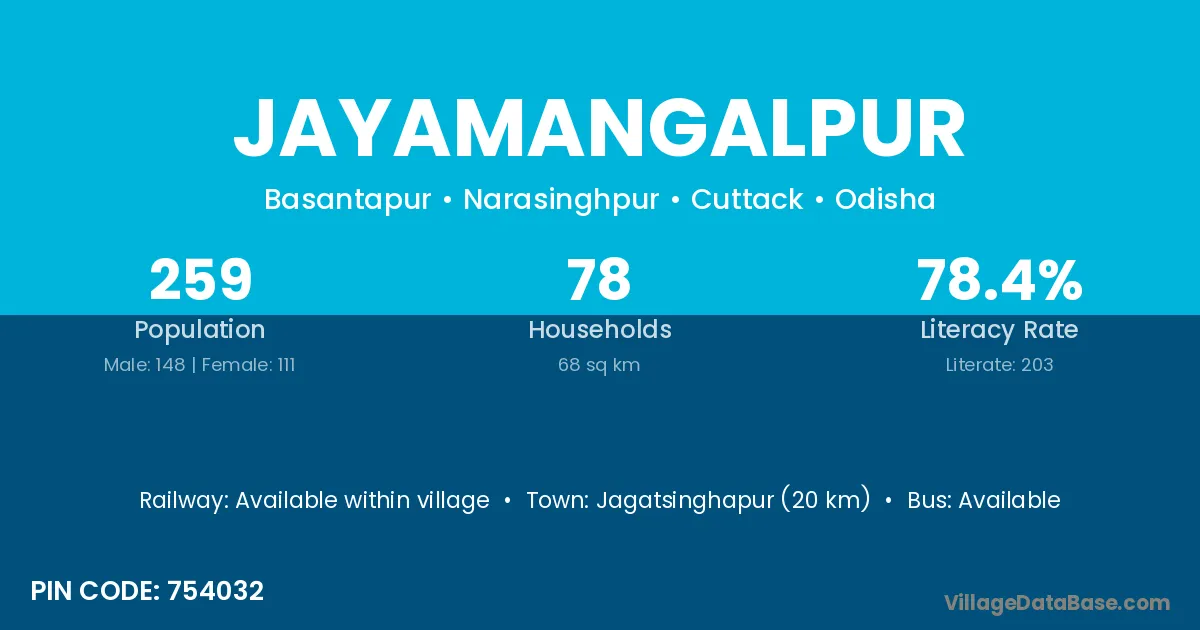 Jagatsinghapur (20 km) is the nearest town to Jayamangalpur village for major economic activities and is located approximately 20 km away.