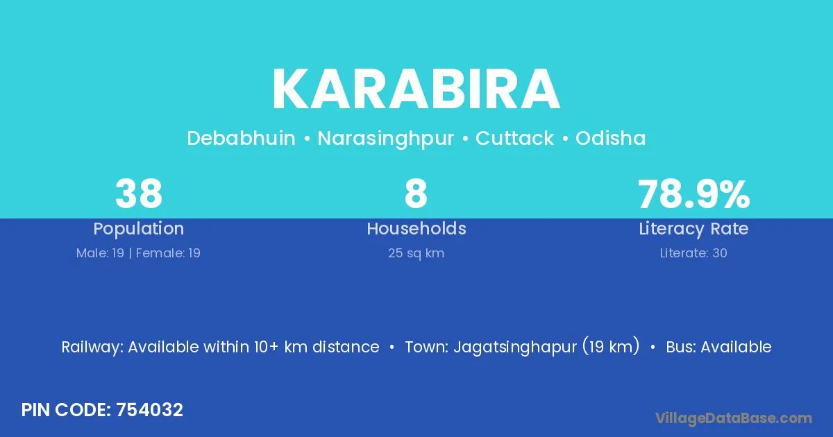 Jagatsinghapur (19 km) is the nearest town to Karabira village for major economic activities and is located approximately 19 km away.