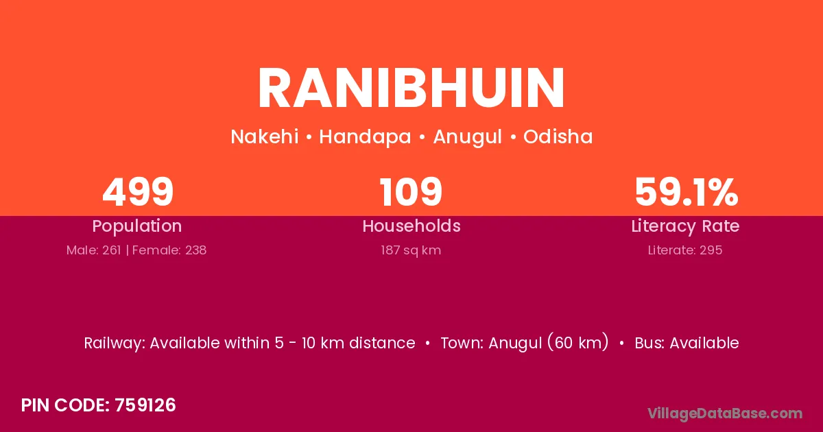 Ranibhuin village has a total population of 502 people, of which 256 are males and 246 are females.