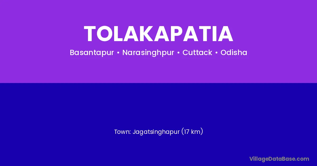 Jagatsinghapur (17 km) is the nearest town to Tolakapatia village for major economic activities and is located approximately 17 km away.