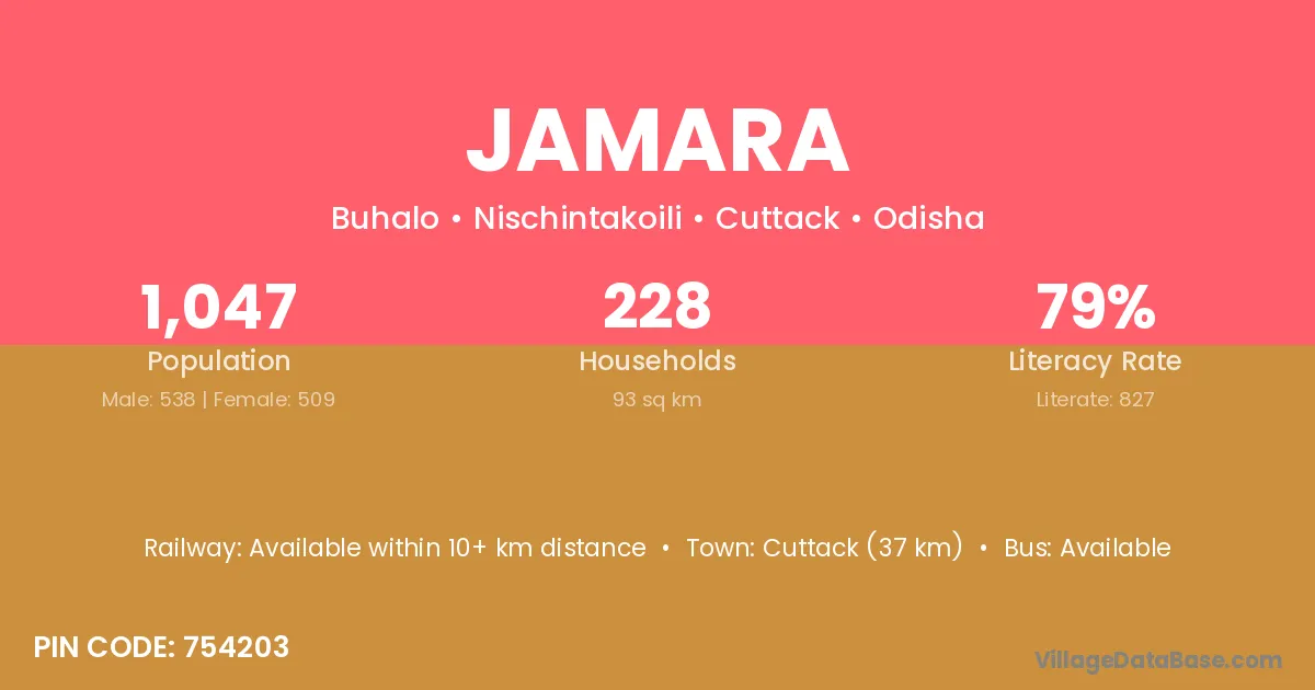 Cuttack (50 km) is the nearest town to Jamara village for major economic activities and is located approximately 50 km away.