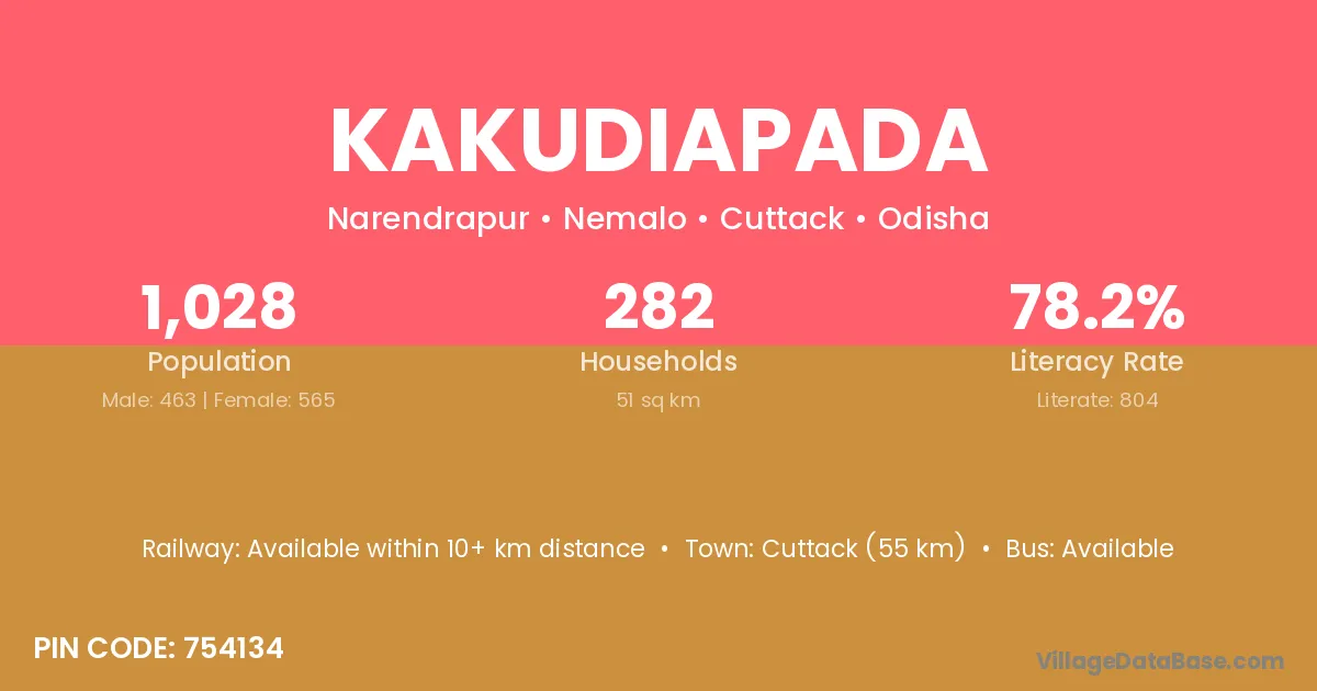 Cuttack (55 km) is the nearest town to Kakudiapada village for major economic activities and is located approximately 55 km away.