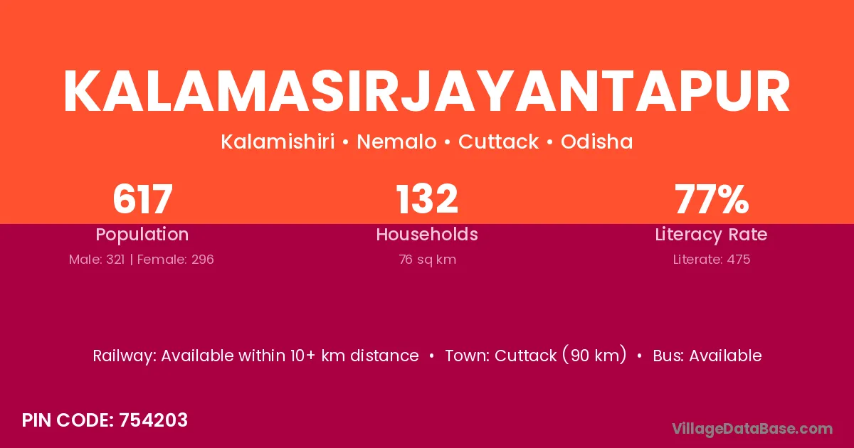 Cuttack (90 km) is the nearest town to Kalamasirjayantapur village for major economic activities and is located approximately 90 km away.