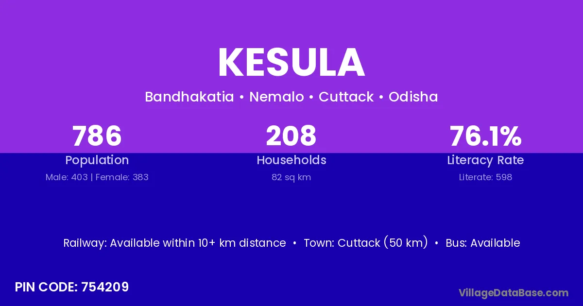 Cuttack (50 km) is the nearest town to Kesula village for major economic activities and is located approximately 50 km away.