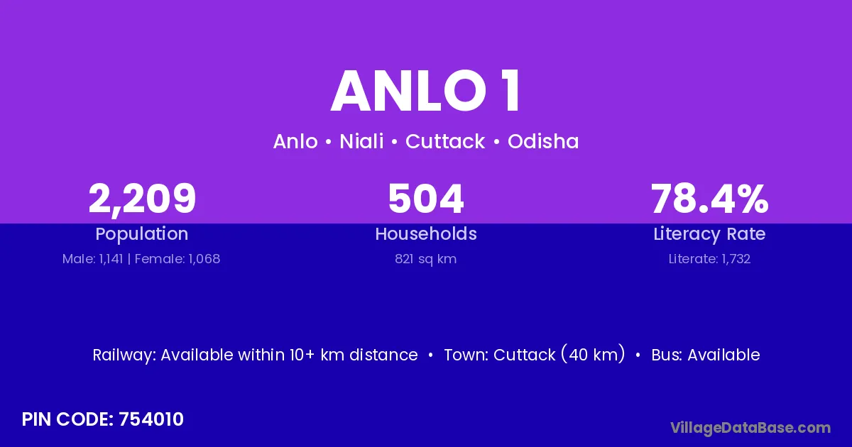 Cuttack (40 km) is the nearest town to Anlo 1 village for major economic activities and is located approximately 40 km away.
