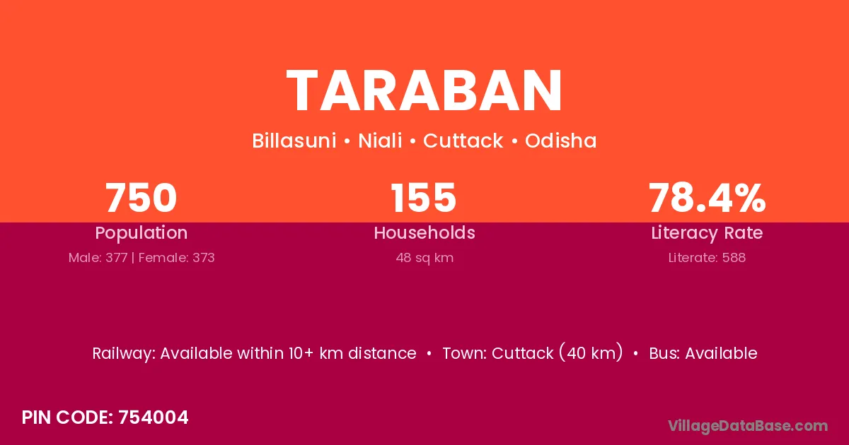 Cuttack (40 km) is the nearest town to Taraban village for major economic activities and is located approximately 40 km away.