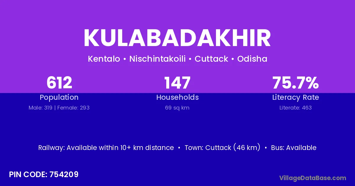 Cuttack (46 km) is the nearest town to Kulabadakhir village for major economic activities and is located approximately 46 km away.