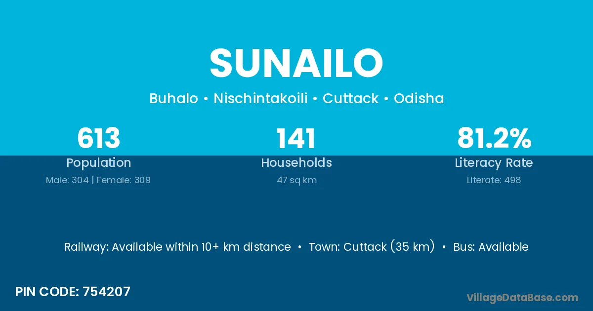 Cuttack (35 km) is the nearest town to Sunailo village for major economic activities and is located approximately 35 km away.