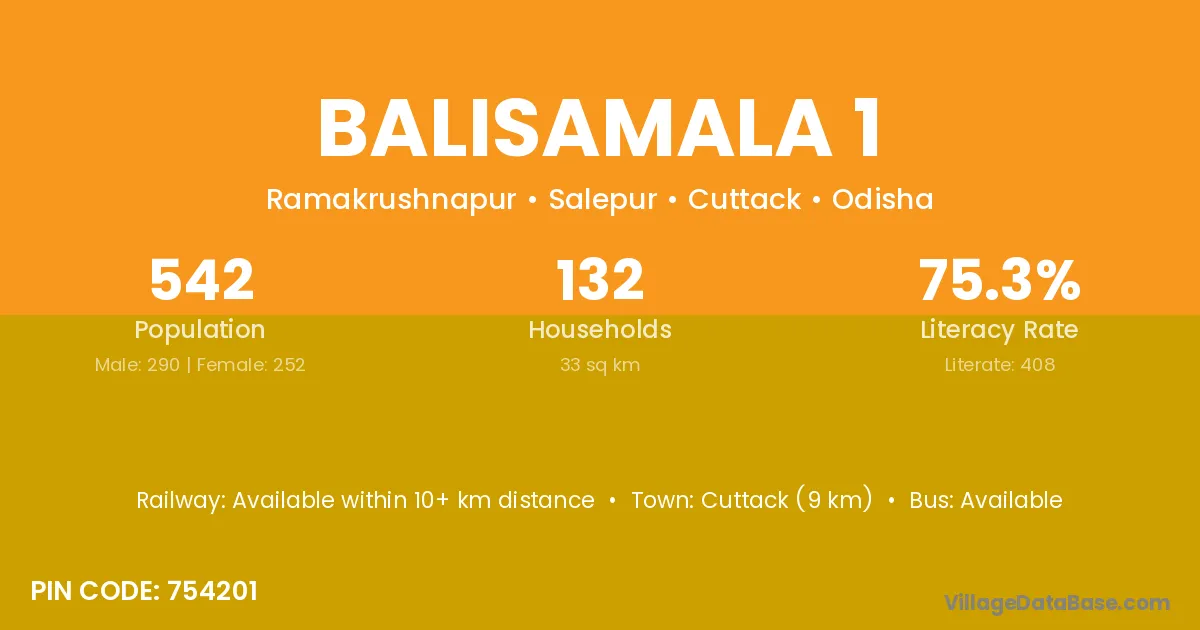Balisamala 1 village has a total population of 542 people, of which 290 are males and 252 are females.