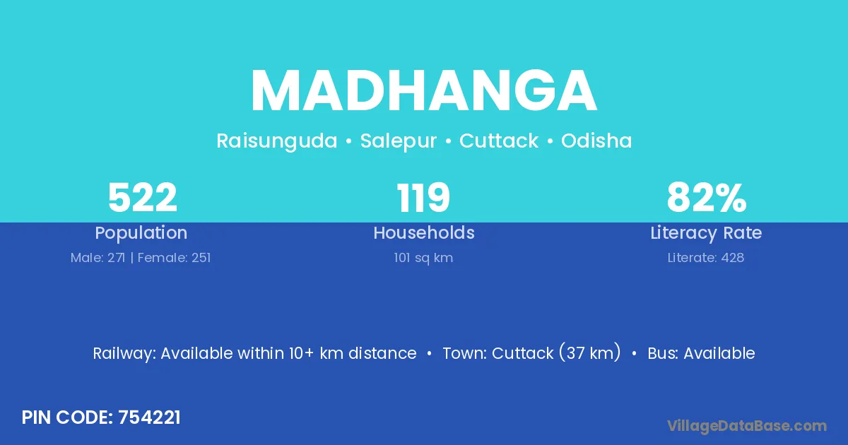 Cuttack (37 km) is the nearest town to Madhanga village for major economic activities and is located approximately 37 km away.