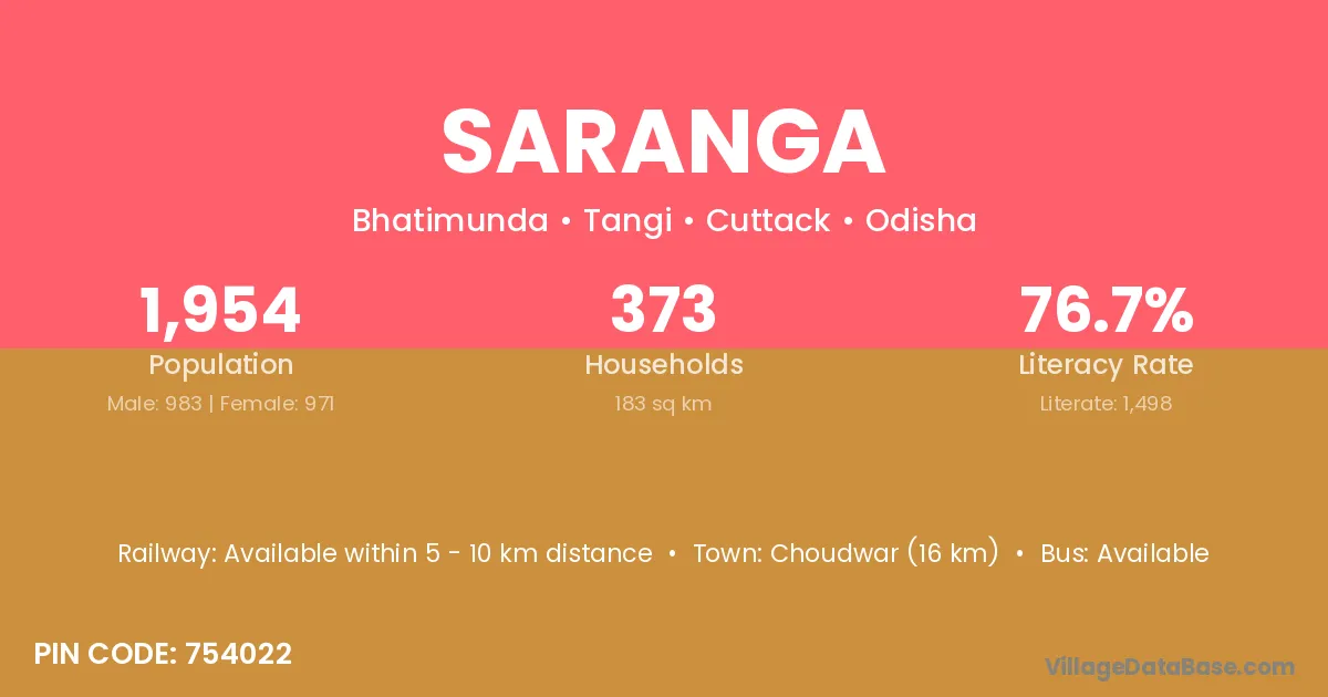 Choudwar (16 km) is the nearest town to Saranga village for major economic activities and is located approximately 16 km away.