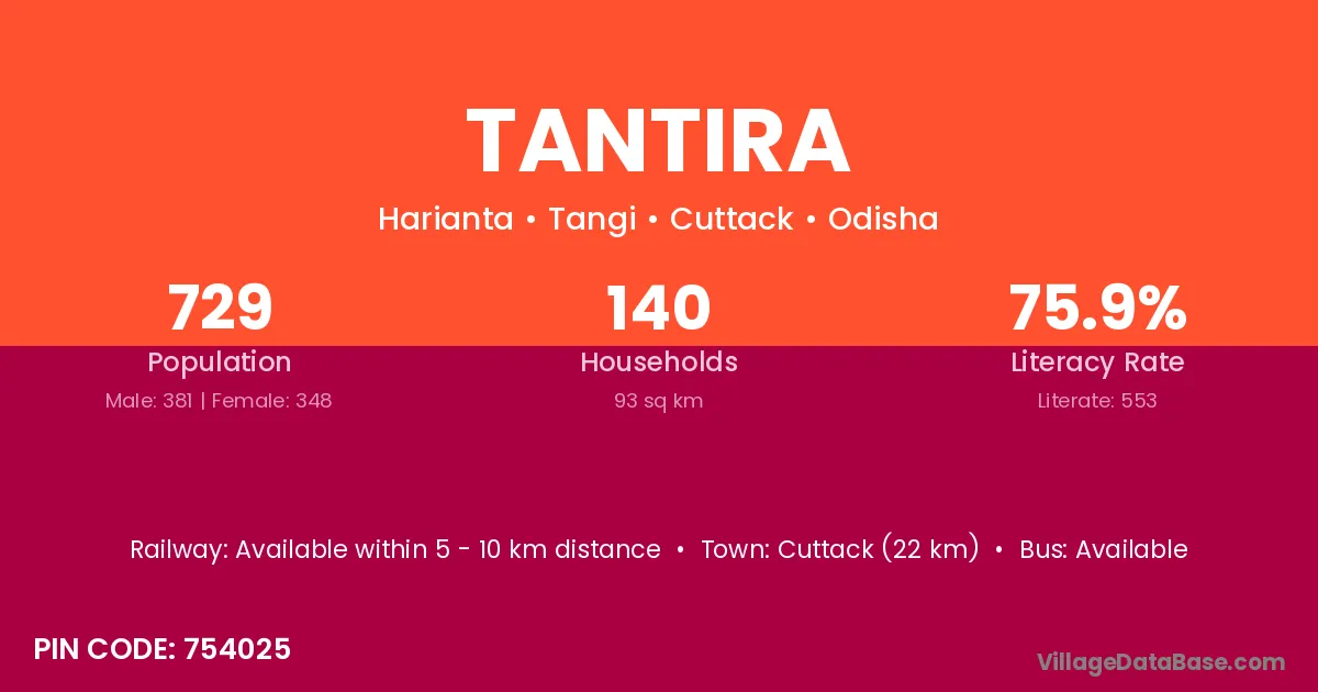 Cuttack (22 km) is the nearest town to Tantira village for major economic activities and is located approximately 22 km away.