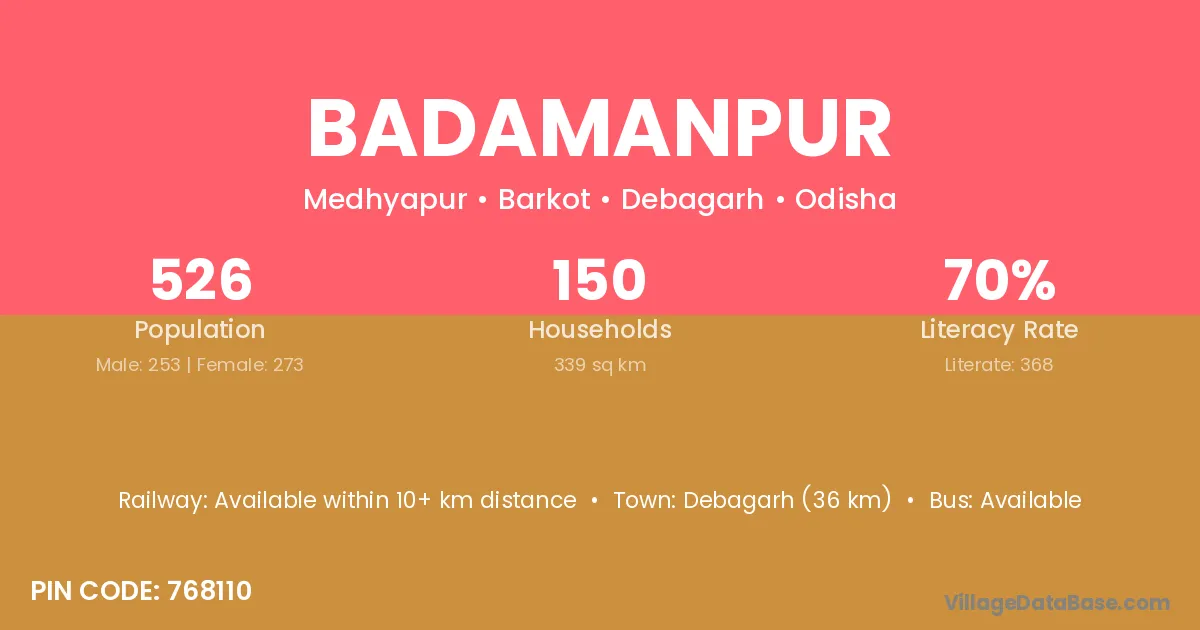 Debagarh (36 km) is the nearest town to Badamanpur village for major economic activities and is located approximately 36 km away.