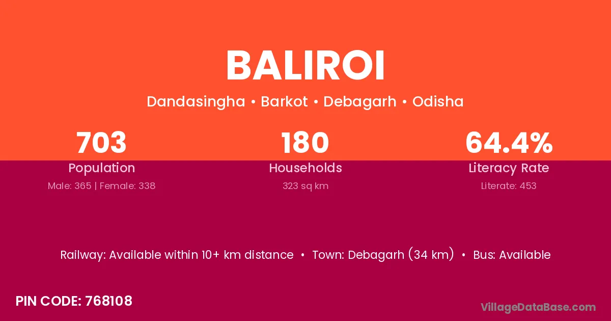 Debagarh (34 km) is the nearest town to Baliroi village for major economic activities and is located approximately 34 km away.