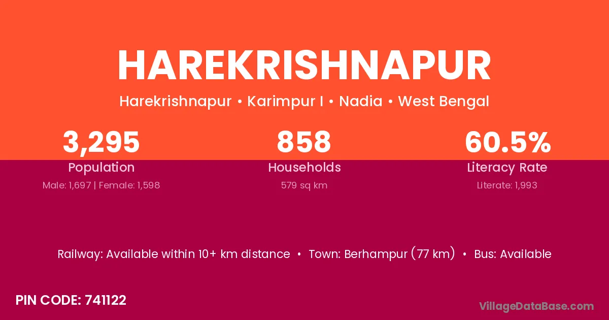 The literacy rate of Harekrishnapur village is 66.06%. Male literacy stands at 78.61% and female literacy at 54.27%.