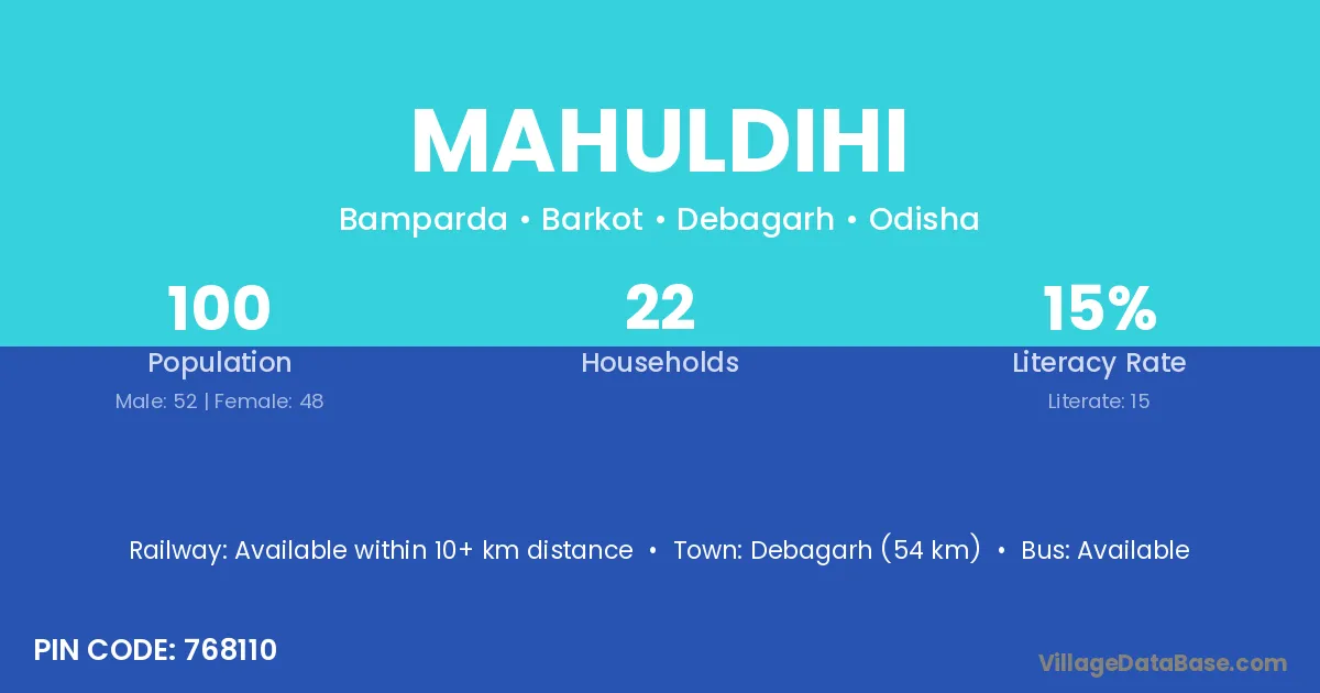 Debagarh (54 km) is the nearest town to Mahuldihi village for major economic activities and is located approximately 54 km away.