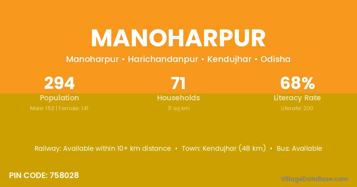 Debagarh (28 km) is the nearest town to Manoharpur village for major economic activities and is located approximately 28 km away.