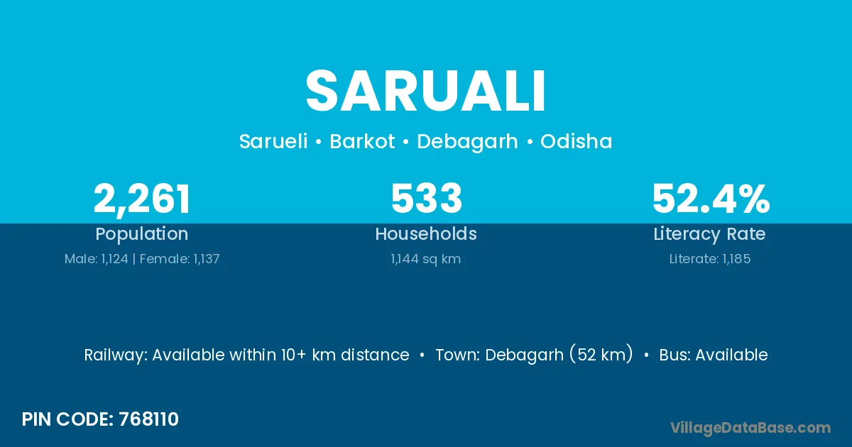 Debagarh (52 km) is the nearest town to Saruali village for major economic activities and is located approximately 52 km away.
