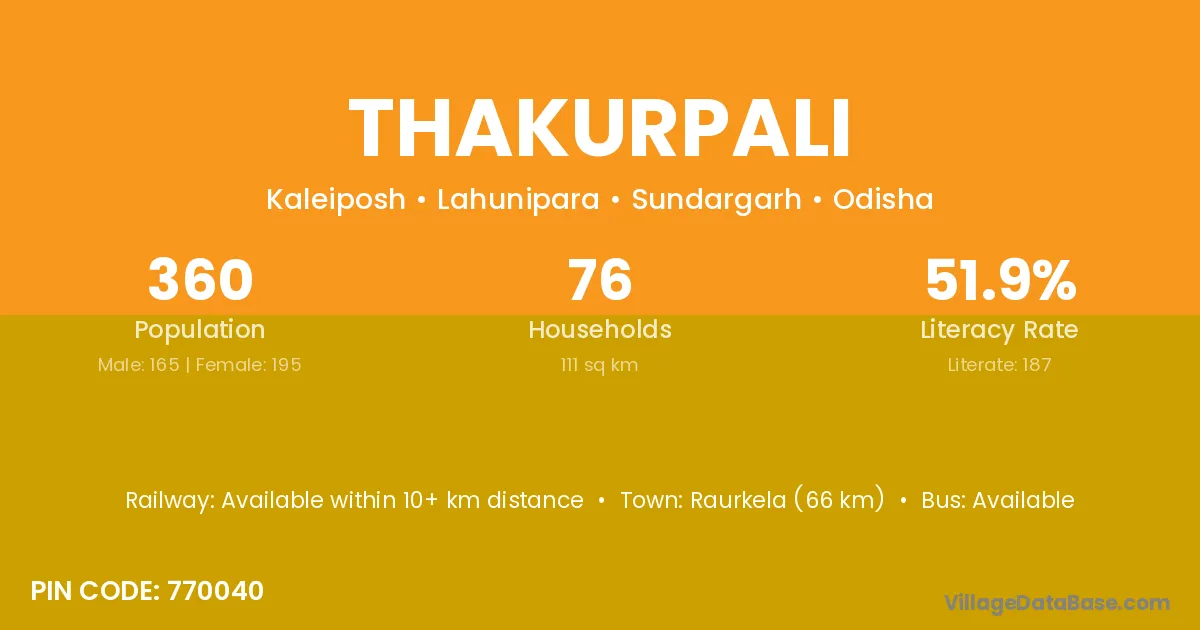 The literacy rate of Thakurpali village is 65.96%. Male literacy stands at 76.09% and female literacy at 56.25%.