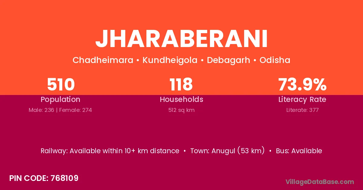 Anugul (53 km) is the nearest town to Jharaberani village for major economic activities and is located approximately 53 km away.
