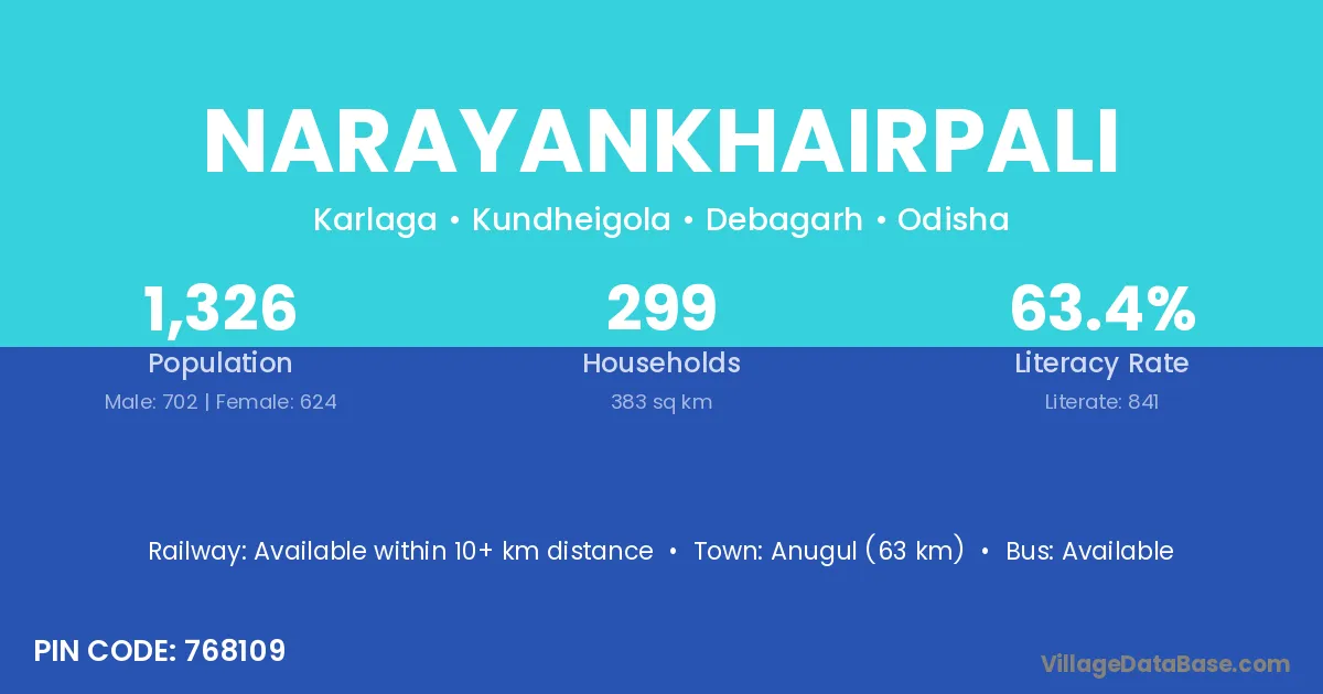 Anugul (63 km) is the nearest town to Narayankhairpali village for major economic activities and is located approximately 63 km away.