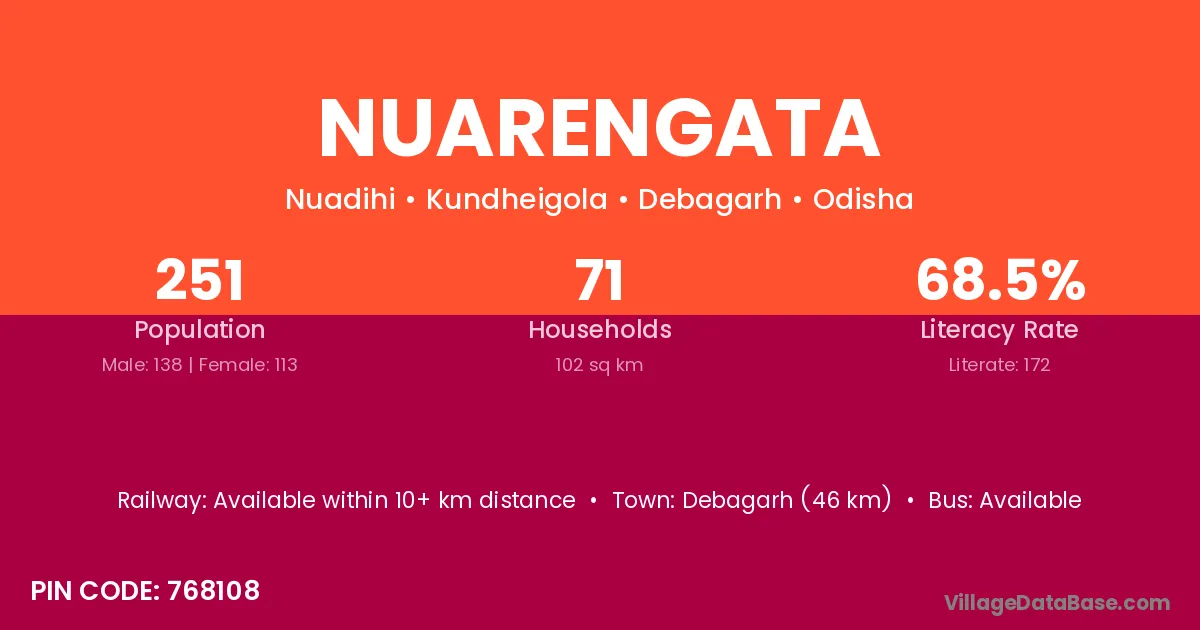 Debagarh (46 km) is the nearest town to Nuarengata village for major economic activities and is located approximately 46 km away.