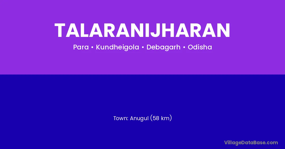 Anugul (58 km) is the nearest town to Talaranijharan village for major economic activities and is located approximately 58 km away.