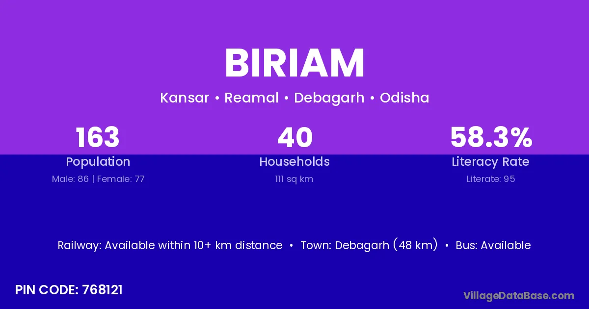 Debagarh (48 km) is the nearest town to Biriam village for major economic activities and is located approximately 48 km away.
