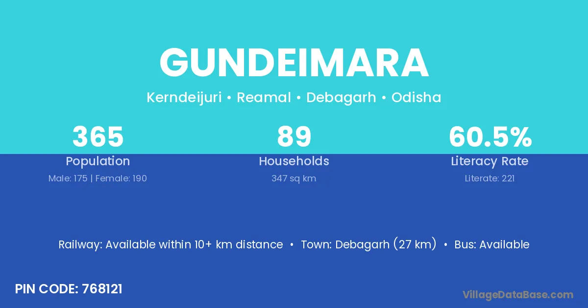 Debagarh (27 km) is the nearest town to Gundeimara village for major economic activities and is located approximately 27 km away.