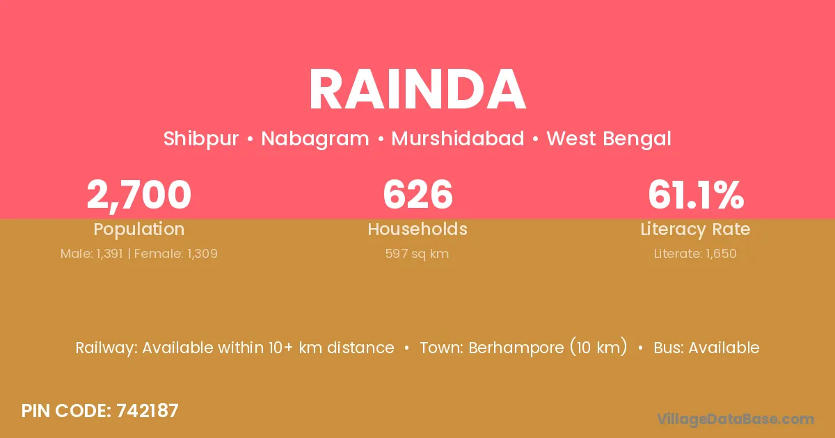 Debagarh (52 km) is the nearest town to Rainda village for major economic activities and is located approximately 52 km away.