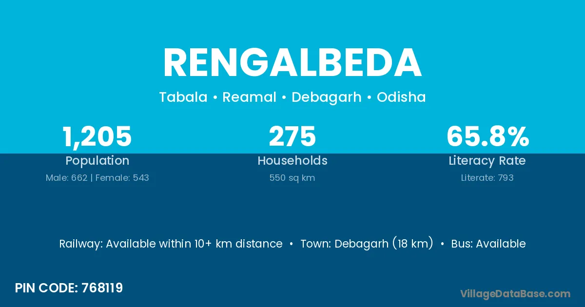 Debagarh (18 km) is the nearest town to Rengalbeda village for major economic activities and is located approximately 18 km away.