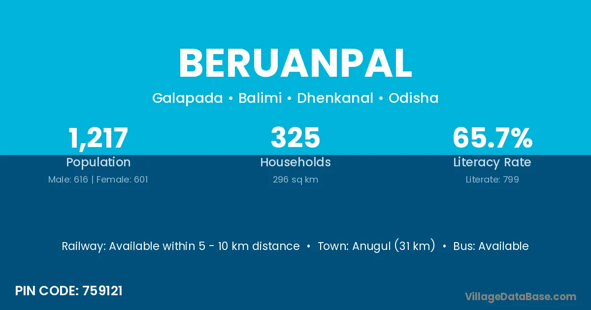 Anugul (31 km) is the nearest town to Beruanpal village for major economic activities and is located approximately 31 km away.